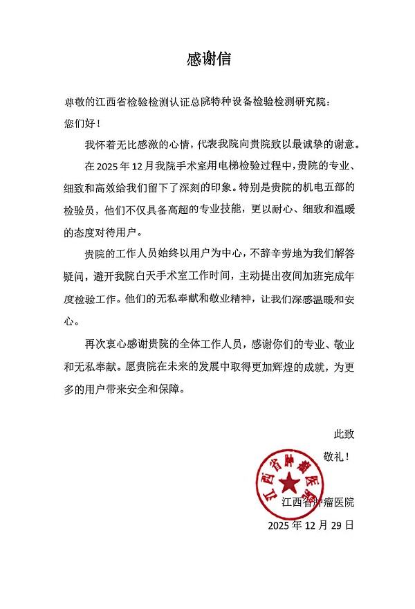 总院特检院收到江西省肿瘤医院感谢信