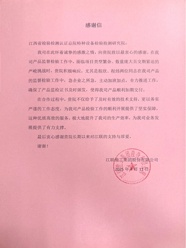 近日,总院特检院直属三支部收到江联重工集团股份有限公司的感谢信,信中对直属第三党支部党员先锋在紧急关头展现的专业素养和担当精神表达诚挚谢意。