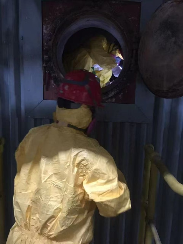 在检验垃圾焚烧锅炉时,该作业面临二噁英等高危化学物质风险及恶劣气味环境,需全程穿戴防护装备。锅炉内部粉尘弥漫、视线受阻,检验人员需借助头灯谨慎排查缺陷。此类任务为支部日常工作常态