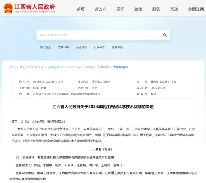 近日,江西省人民政府发布了《江西省人民政府关于2024年度江西省科学技术奖励的决定》(赣府发〔2025〕13号),公布了2024年度江西省科学技术奖励的获奖名单。由总院特检院参与申报的“智能焊接机器人焊缝跟踪与焊接缺陷识别关键技术及应用”项目成果荣获省科学技术进步奖二等奖。